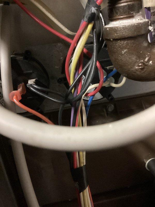 Performed diagnostic evaluation of electrical system on aging heating unit (10+ years) due to no-heat complaint. Inspection revealed deteriorated wiring connections with visible insulation degradation and improper bundling. Replaced damaged wiring, properly secured connections with appropriate wire nuts and electrical tape, and verified continuity throughout system. Unit restored to proper operation with heat output confirmed within manufacturer specifications.