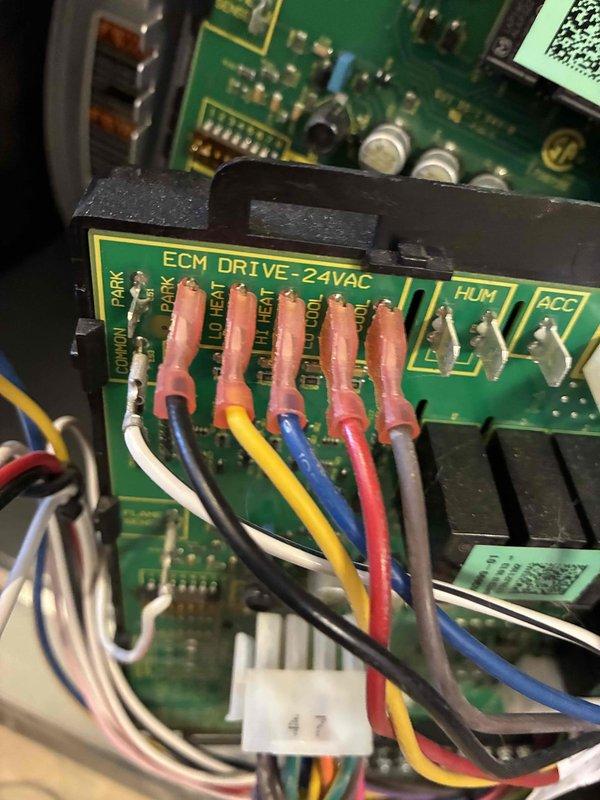 Diagnosed and repaired no-heat condition on system under 10 years old. Inspection revealed loose connections on ECM drive terminal board with multiple wires (white, yellow, blue, red, gray) requiring reconnection. Secured all connections using proper wire connectors and verified proper operation after repair.