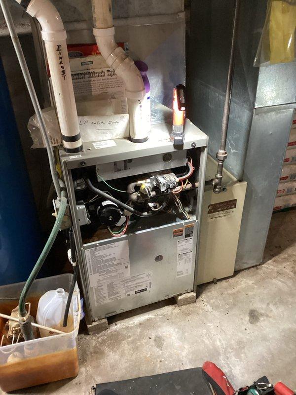 Responded to no-heat call for residential HVAC system. Performed diagnostic assessment of furnace with front panel removed to access internal components. Inspected control board, wiring connections, ignition system, and blower motor assembly. Identified and corrected issue, restoring proper heating function to the system.