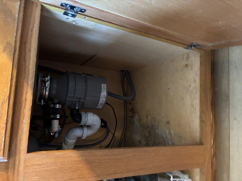 Conducted inspection of under-sink plumbing system, identifying potential moisture damage to cabinet interior. Observed black pump unit with connected PVC piping and electrical components. System appears to be a garbage disposal or water pump installation showing signs of aging. Recommended monitoring for leaks and possible future replacement of affected cabinetry.