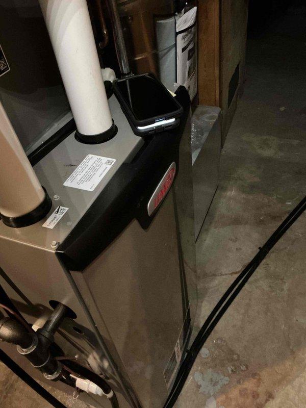 Performed routine tune-up service on Lennox furnace system. Inspected ventilation pipes and plumbing connections for proper installation and function. Temperature diagnostics showed normal operating parameters at 118.4°F on heat exchanger surface. All components tested within manufacturer specifications with no issues identified.