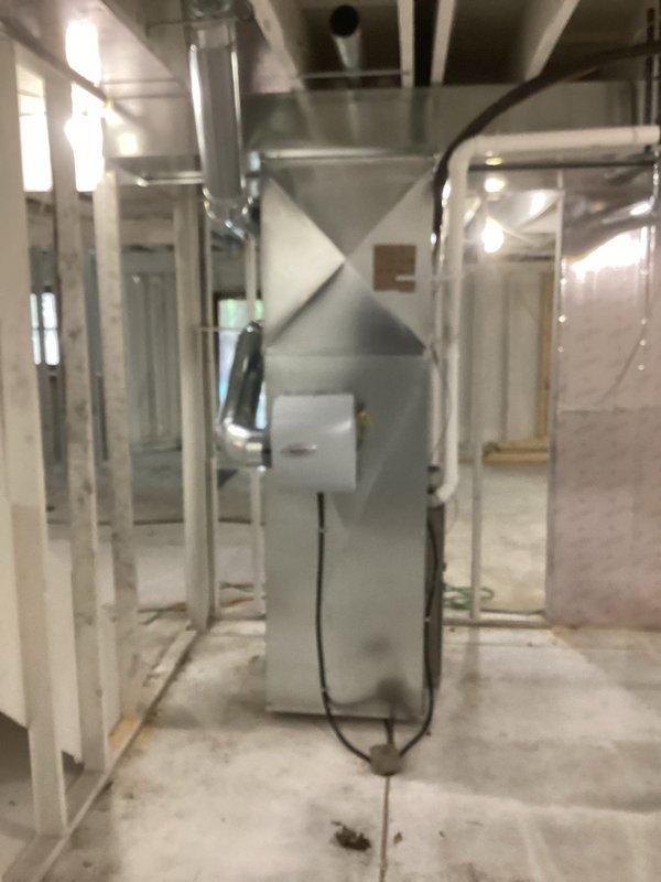 Conducted inspection of HVAC system in unfinished basement mechanical room. Observed central furnace unit with connected metal ductwork extending to ceiling distribution points. Verified proper installation of ventilation components and electrical connections within the ongoing construction environment.