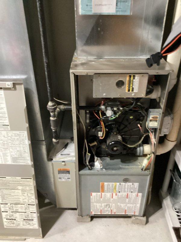 Responded to no heat call for aging furnace (10+ years). Upon inspection, accessed internal components by removing access panel, revealing blower motor assembly, electrical connections, and control board. Performed diagnostic testing, cleaned accumulated dust from critical components, and verified proper operation of gas line and safety systems before returning unit to service.
