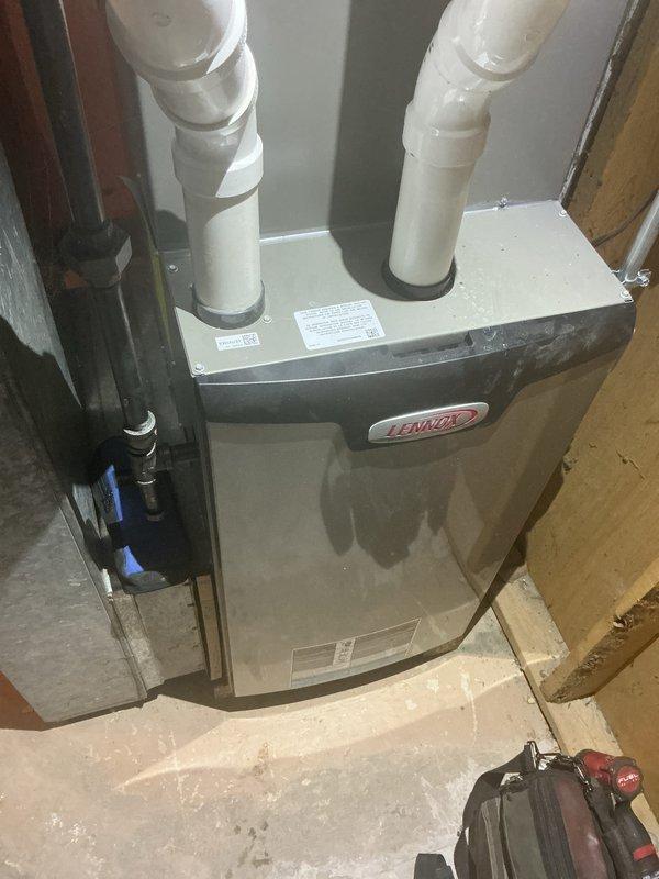 Performed routine maintenance on Lennox furnace system located in basement. Inspected exhaust and intake PVC venting, checked all gas and plumbing connections, and verified proper installation compliance. System is functioning within normal parameters with no immediate concerns identified.