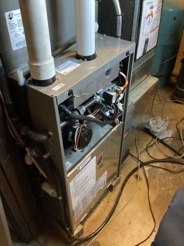 Performed comprehensive furnace tune-up on residential unit, including inspection of internal components (blower motor, wiring harnesses, and mechanical parts). System appears to be in functional condition with proper ventilation through PVC exhaust pipes. No significant issues detected during maintenance service.
