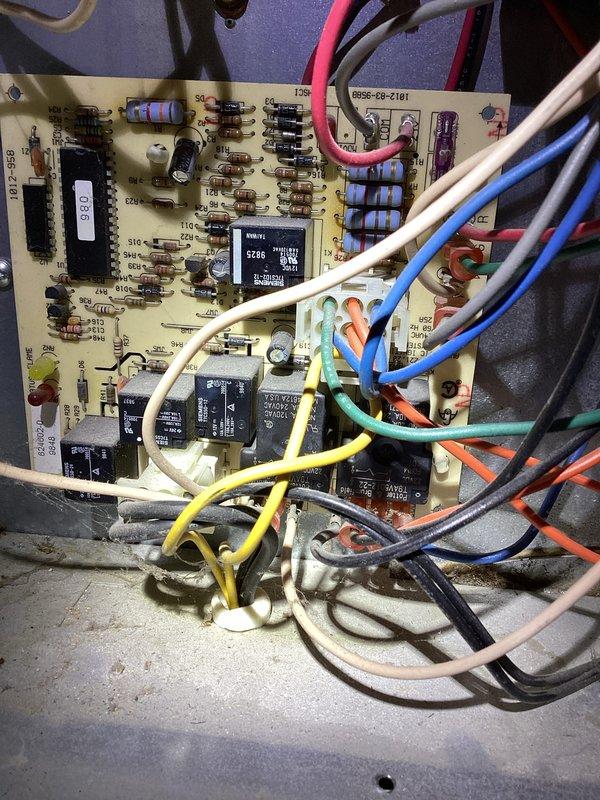 Performed diagnostic assessment on 10+ year old heating system not producing heat. Inspected control board and wiring connections in furnace, finding loose connections and slight corrosion on the main circuit board terminals. Reconnected and secured all wiring harnesses, particularly focusing on the multicolored control wires connected to the circular component. Cleaned corrosion from terminals and verified proper voltage to the ignition system. System now operating correctly with consistent flame ignition and proper heating cycle.