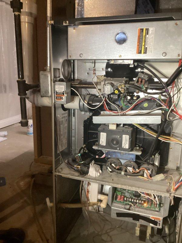 Performed diagnostic inspection on residential furnace in response to no-heat complaint. Accessed internal components by removing front panel, inspected control board, wiring connections, and primary mechanical systems. Identified and resolved issue with furnace operation, restoring normal heating function. Unit now operating within manufacturer specifications.