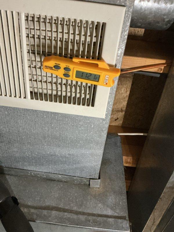 Performed comprehensive HVAC tune-up with temperature diagnostics, recording supply air temperature of 112.1°F using Fieldpiece digital thermometer. System exhibited normal operation with adequate airflow through vents. Inspected ductwork and housing in utility space, noting some dust accumulation consistent with regular usage, but no significant issues requiring immediate attention.