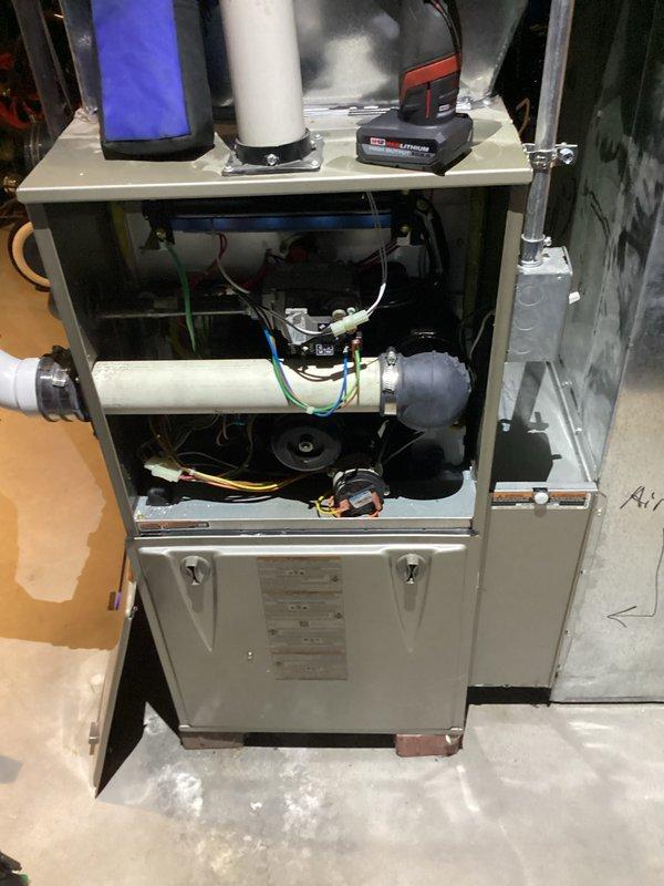 Performed diagnostic inspection on customer's furnace unit after reported heating issues. Opened front panel to examine internal components including blower motor, control board, and exhaust system. All connections and wiring were verified secure, and system was tested through complete operation cycle with proper functionality confirmed.
