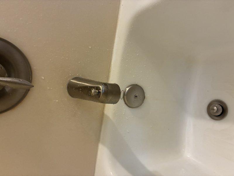 Responded to service call for malfunctioning bathtub diverter and tub spout assembly. Upon inspection, found the diverter handle detached and hanging improperly from mounting position, preventing proper operation of the shower/tub fixture. Removed the existing chrome diverter component and spout assembly from the ceiling-mounted configuration. Secured the diverter mechanism back into proper mounting position, ensuring flush installation against the wall surface. Tested the tub spout and diverter functionality to verify proper water flow direction between tub spout and showerhead. Additionally inspected the bathroom sink faucet and noted mineral deposits on the brushed metal finish but confirmed proper operational function of the wall-mounted single-handle fixture and popup drain assembly.