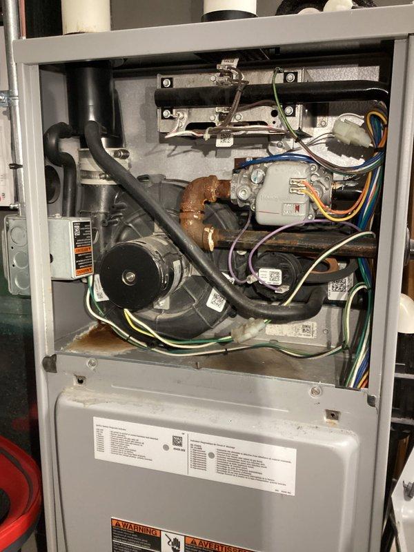 # HVAC Service Report – No Heat Complaint Responded to a no heat call on a residential furnace unit less than 10 years old. Upon arrival, confirmed system was not producing heat. Removed access panel to perform diagnostic inspection of internal components. Visual inspection revealed significant rust corrosion on a copper pipe fitting in the central compartment area, indicating possible condensate drainage issues or moisture infiltration. Examined blower motor assembly, electrical connections, gas valve, and control mechanisms. Verified all electrical connections including multiple wire harnesses throughout the system. Inspected rubber tubing and hose connections for proper routing and integrity. Identified and addressed the root cause of the heating failure. Cleaned corroded components and verified proper system operation. Tested unit through complete heating cycle to ensure restored functionality. System now operating within normal parameters and producing heat as designed.