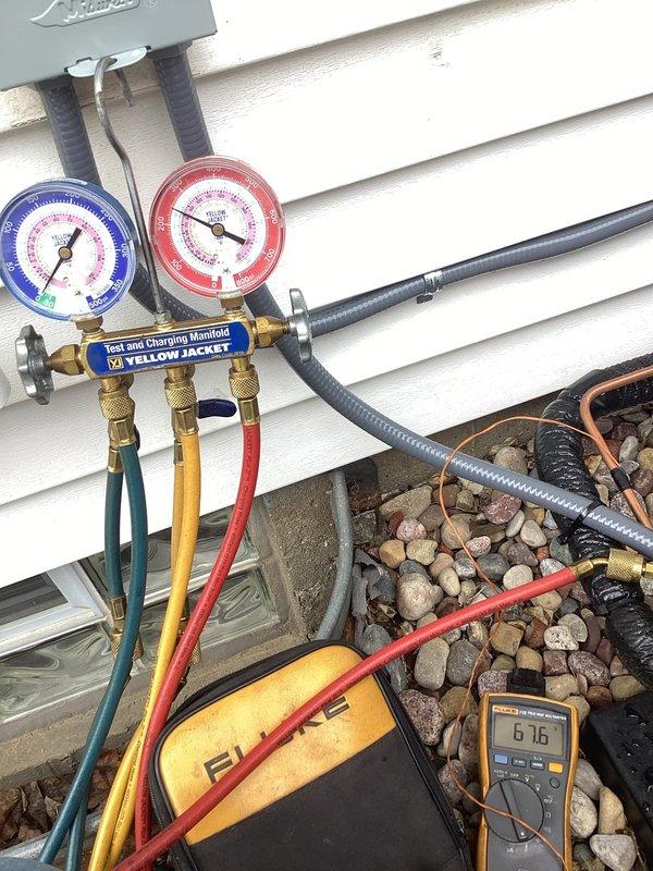 Completed system start-up and commissioning of newly installed HVAC equipment. Utilized Yellow Jacket manifold gauge set to verify refrigerant pressures and system charge, confirming proper operating parameters on both high and low sides. Performed electrical diagnostics with digital multimeter to ensure correct voltage and amperage readings throughout the system, verifying all components are functioning within manufacturer specifications.