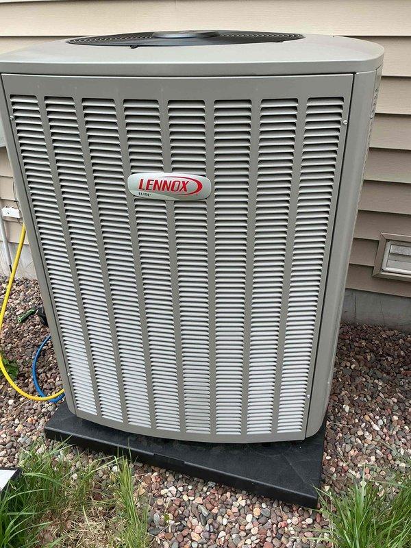 Completed full HVAC system installation featuring a Lennox cylindrical condenser unit mounted on vibration-dampening pad with proper gravel base for drainage and stability. Installed electrical disconnect box with conduit run to unit, routed and insulated refrigerant lines to indoor air handler, evacuated system using vacuum pump to remove moisture and contaminants, and charged system to manufacturer specifications. Performed diagnostic verification using manifold gauges and digital meter, confirming proper refrigerant pressures, temperatures, and system operation across all parameters.