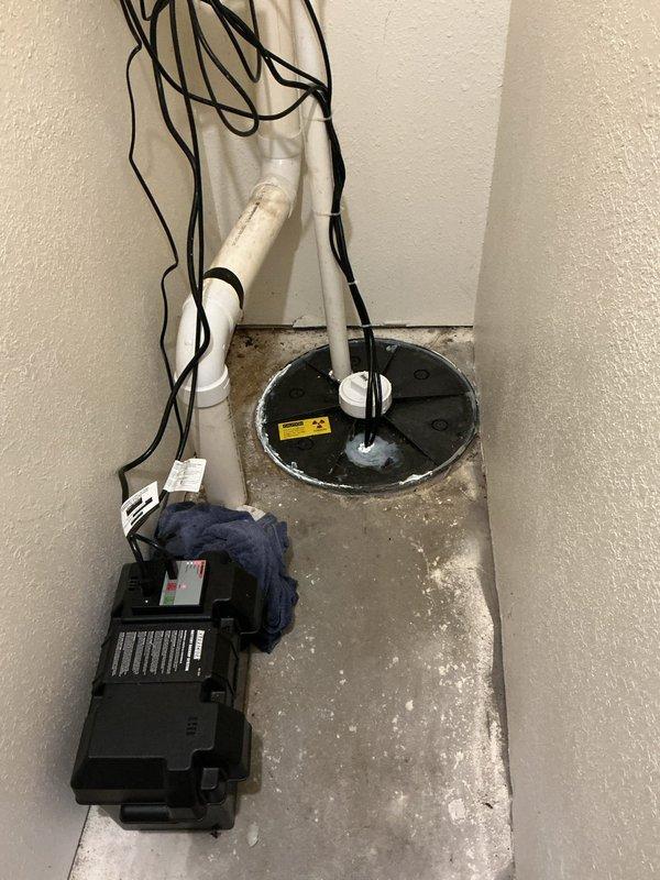 Completed sump pump system inspection and service in basement utility area. Verified proper operation of pump, discharge piping, and electrical connections; confirmed basin is free of debris and functioning correctly. All components including PVC discharge pipe, pump lid with safety label, and associated electrical wiring are in working order with no immediate repairs required.