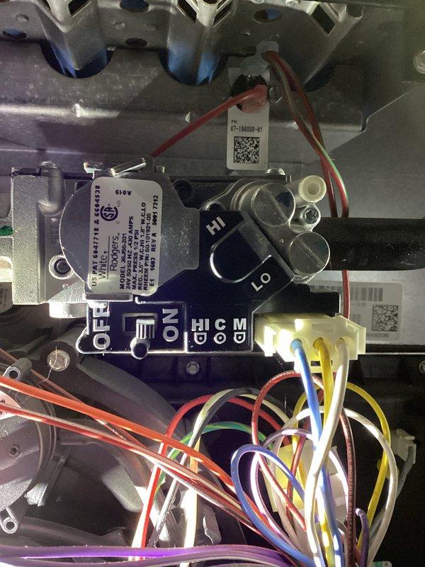 Diagnosed and serviced gas valve control module on HVAC system that was not producing heat. Inspected wiring connections to control board (HI, C, M, D terminals) and verified proper operation of gas valve switch positions. System is now functioning correctly with proper heat output.