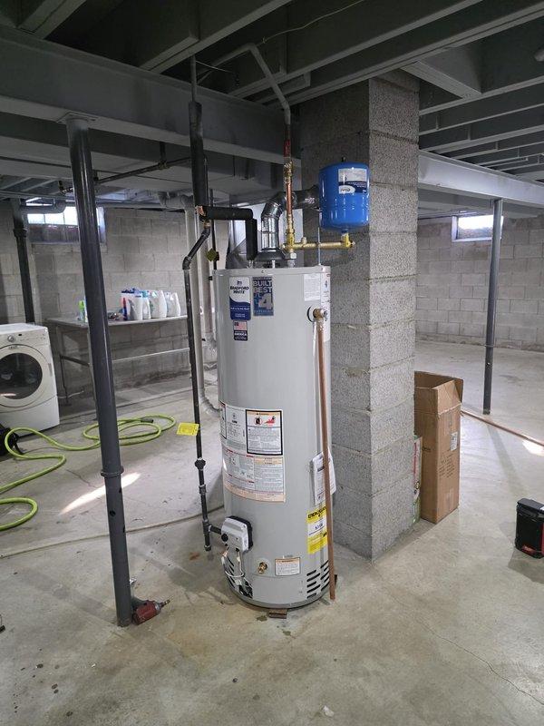 Completed installation of a new tanked water heater in unfinished basement area. System includes proper connections to existing copper and black pipe infrastructure, with a blue expansion tank mounted on adjacent wall. All required valves and safety features installed according to code.