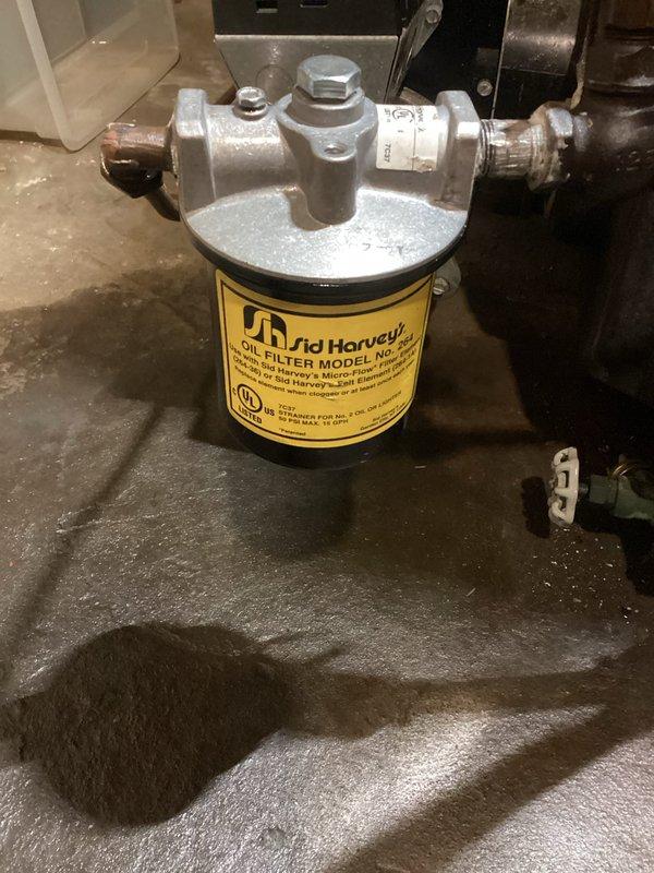 Performed routine maintenance on boiler system including replacement of Sid Harvey oil filter to ensure optimal fuel delivery. Visual inspection showed proper installation with no leaks at connection points. System returned to normal operation with improved efficiency.
