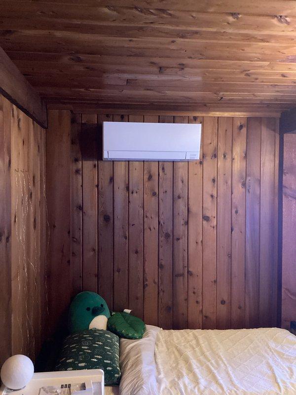Successfully installed a mini-split air conditioning unit in a wood-paneled room. The indoor air handler was properly mounted on the wall above the bed, ensuring optimal airflow distribution throughout the space. System was tested and confirmed to be operating correctly.