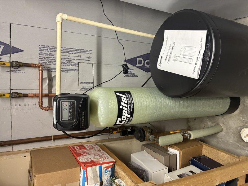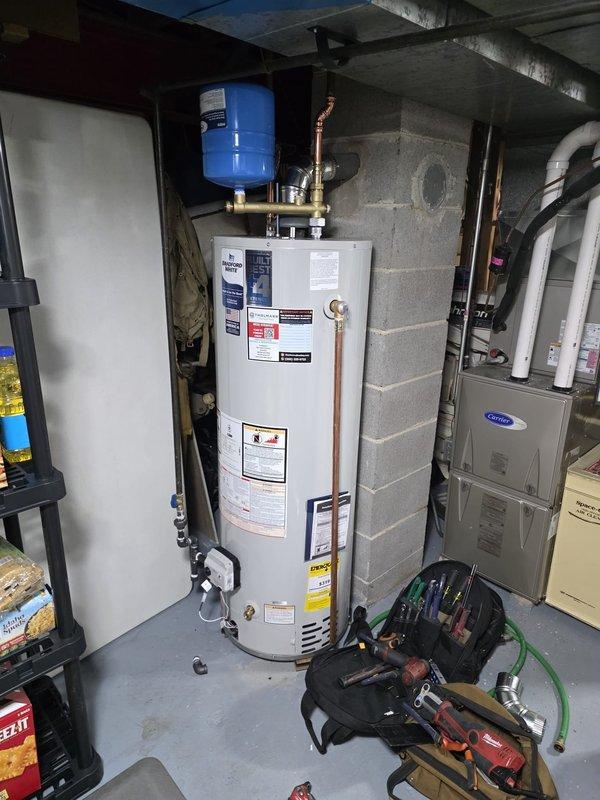 # Plumbing Install - Tanked Water Heater Completed installation of residential tanked water heater in basement utility area. Installed new cylindrical water heater tank on concrete floor with proper positioning and clearances. Connected hot and cold water supply lines using copper piping with professional compression fittings and joints, forming proper loop configuration at top of unit. Installed brass shut-off valves on both supply lines for isolation and maintenance access. Connected gray galvanized pipe at bottom drain port. Mounted water softener control unit with digital display panel on top of water heater, securing all connections with appropriate fittings. Routed flexible supply hose to top-mounted control device. Verified all copper pipe joints are secure with no visible leaks. Ensured manufacturer labels and safety specifications remain visible and intact. Installation meets code requirements with proper venting configuration and clearances from walls and ceiling. All plumbi