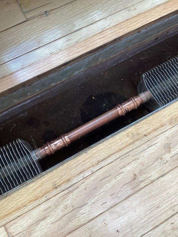 Performed inspection and documentation of existing boiler heating system floor register installation. Observed copper supply piping running beneath flooring with associated heat registers in place and operational. System components showing normal age-related patina with no active leaks or deficiencies noted at time of service.