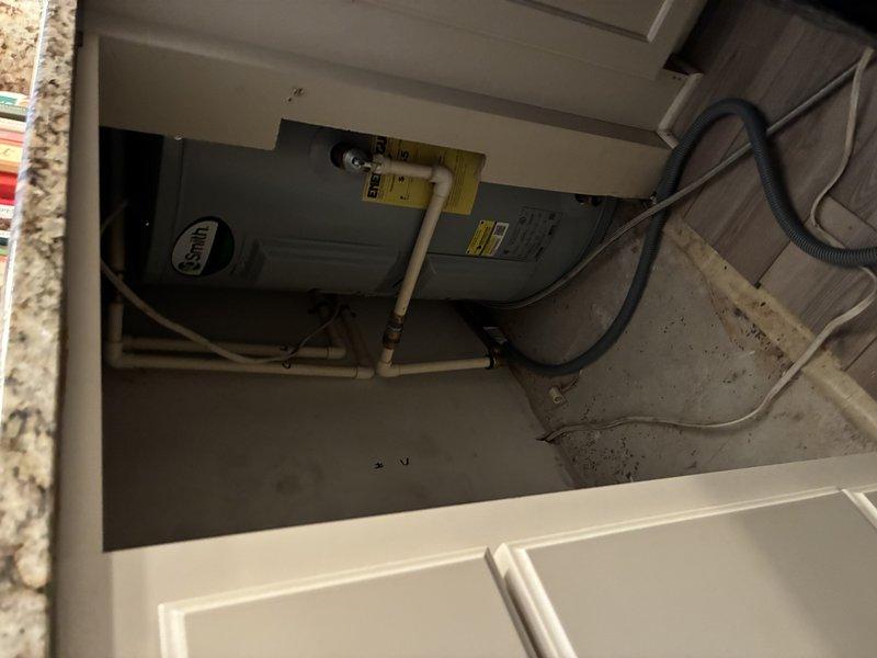Performed visual inspection of Rheem tanked water heater installed in utility cabinet. Unit appears properly connected with PVC piping and drainage system. Noted some floor staining beneath unit which may indicate previous minor leakage. No immediate service actions required at this time.